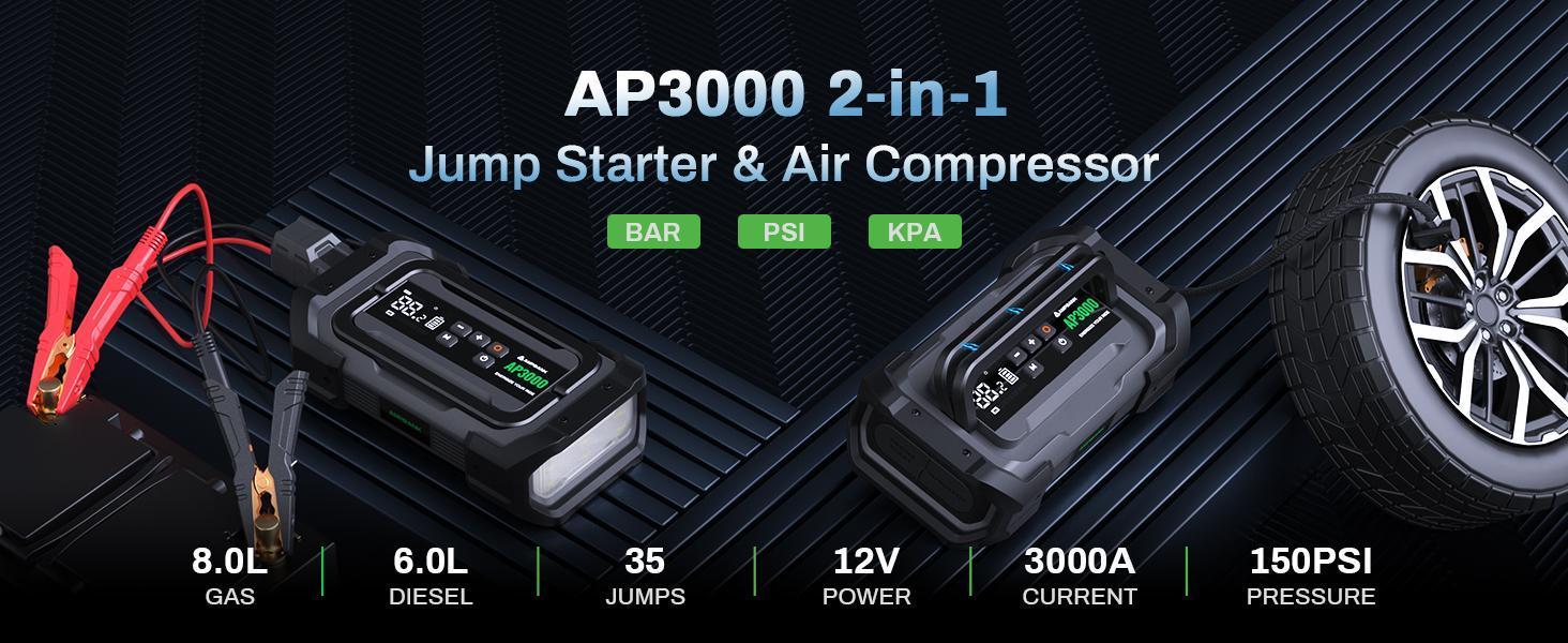 3000A Portable Car Emergency Starter Power Supply With Inflator Function 150PSI Digital Tire Inflator 12V Car Battery Charger With LED Lighting LCD Display